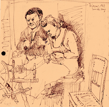 Bernhard und Anneliese beim Spinnen (Lindenberg) 1962, Federzeichnung auf Papier, 20 x 20 cm