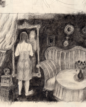 Frau vor dem Spiegel 1964, lavierte Federzeichnung, 22 x 22 cm