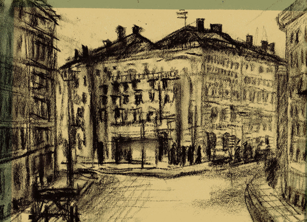 Prenzlauer Berg (Berlin) 1968, Kohlezeichnung auf Papier, 25 x 31 cm
