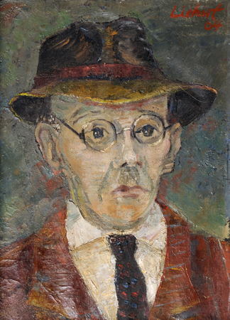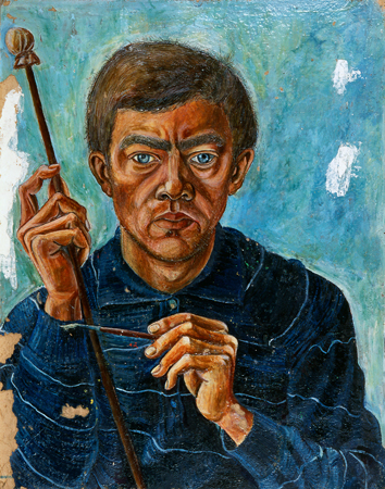 Selbstbildnis mit Malstock 1963, Öl auf Malpappe, 55 x 40 cm