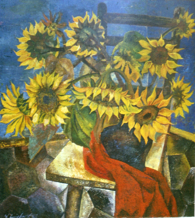 Sonnenblumen mit rotem Tuch 1970, Mischtechnik auf Leinwand, 110 x 100 cm