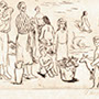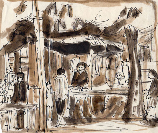 Wochenmarkt (Potsdam) 1962, lavierte Federzeichnung, 15 x 17 cm